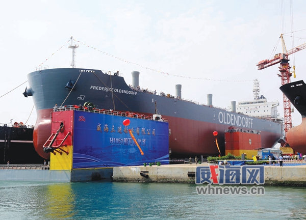当日,位于三进船业厂区E码头浮船坞上的H1051在大型拖船的拖动下缓缓进入深海区,进行下水试验。据介绍,H1051是三进船业重整之前的续建船舶,为58000载重吨大灵便性散货船,全长约190米,宽32.26米,深18.7米,船东为世界知名的德国Oldendorff Carriers。今年1月重整开工后,Oldendorff Carriers便与三进船业积极洽谈此船的销售合作,并于今年6月初正式签订此船的销售合同,预计于明年1月份正式交船。
