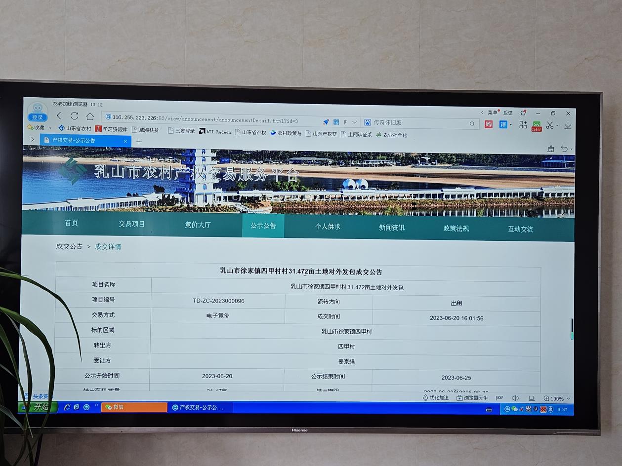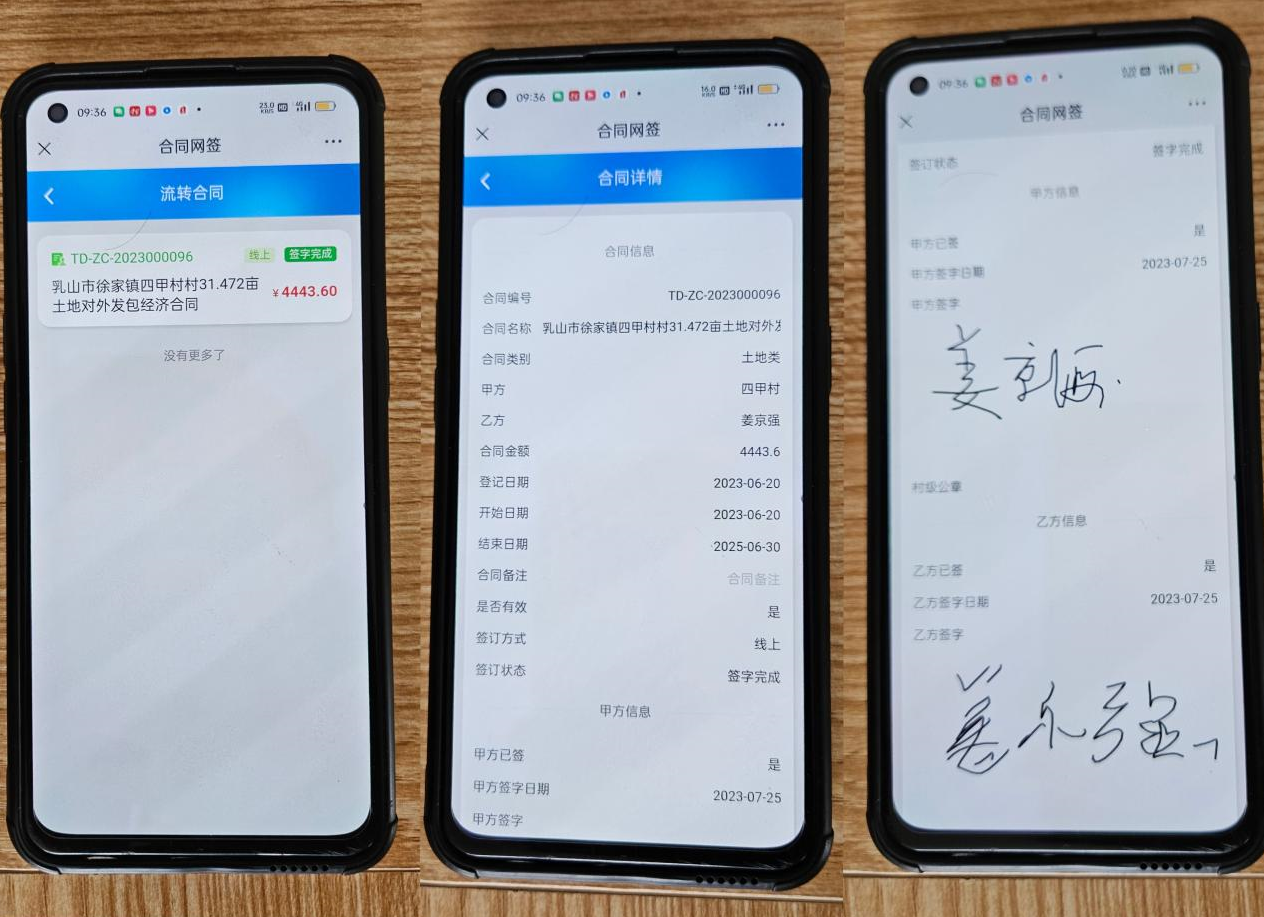 首笔“云签约”内容为乳山市徐家镇四甲村31.472亩村集体山耩地对外发包,底价50元/亩/年,承包年限2年,5名竞价者经过线上报名、线上审核、线上缴费、线上竞价,最终由1名专业大户以70元/亩/年价格竞拍成功,溢价率40%。交易双方通过乳山市农村产权交易服务平台或手机APP,顺利完成合同网上签署和鉴证,成为全省首次在农村产权交易领域引入区块链技术开展的电子合同签署及存证应用。